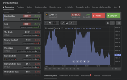 La plataforma de Libertex está pensada para quien quiere ir al grano. Al abrirla, encontrás tus posiciones activas, un buscador de activos, el gráfico de precio y el botón de compra. Sin feeds sociales, sin notificaciones que te inviten a operar más de lo planeado. La Cuenta Invest aparece claramente diferenciada dentro de la aplicación, lo que evita confusiones con la modalidad de CFDs. Para alguien que revisa su cartera una vez por semana, esta interfaz es exactamente lo que necesita.
