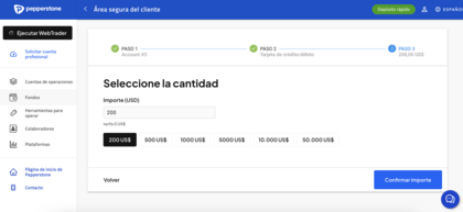 Seleccionar "Tarjeta débito/crédito" en Pepperstone - Indica el monto que deseas depositar.