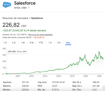 Si tu negocio utiliza software para manejar las relaciones con clientes (Customer Relationship Management o CRM), es muy probable que conozcas a Salesforce. La compañía es el líder indiscutido en el mercado SaaS empresarial, ofreciendo una plataforma robusta y escalable. Para el inversor chileno, CRM ofrece una exposición directa al gasto tecnológico de las empresas a nivel global.