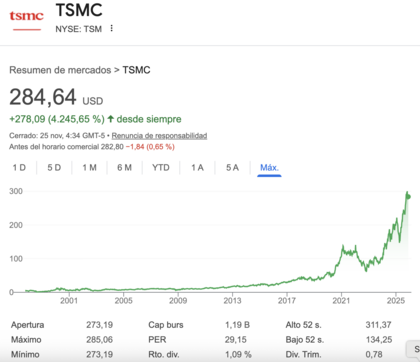 En pocas palabras, TSMC es el fabricante de chips más avanzado del planeta. No diseña semiconductores, sino que los fabrica para gigantes como Apple, NVIDIA y AMD. Para el inversionista chileno, TSM es la forma más directa y diversificada de invertir en la explosión de la Inteligencia Artificial y en la digitalización en general. De hecho, aproximadamente el 90% de los chips más avanzados del mundo se fabrican en sus plantas.
