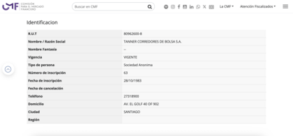 Tanner Corredores está fiscalizada por la Comisión para el Mercado Financiero (CMF), lo que garantiza que cumple con las exigencias legales para operar en el país. Ser una corredora supervisada por la CMF implica transparencia, solvencia y protección para los clientes frente a malas prácticas.