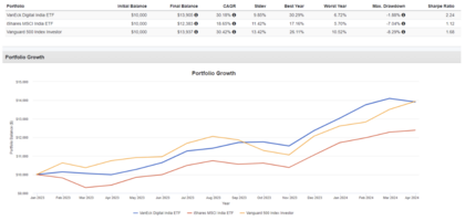 Desde su creación en 2022, este ha sido su desempeño, comparándolo con un ETF que sigue al MSCI India y al S&P 500: Desempeño ETF DGIN Aunque tiene un Retorno Anual Compuesto similar al del S&P 500, su volatilidad es menor, al igual que su caída máxima, y obviamente supera a un índice más amplio con exposición a India, como el MSCI.
