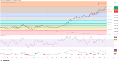 Los indicadores técnicos reflejan una extensión alcista con posible sobrecompra: el RSI supera los 77, señalando presión compradora intensa, mientras que el MACD continúa ensanchando al alza, confirmando un fuerte momentum.