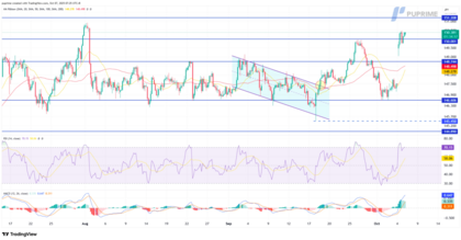 USD/JPY ha registrado una ruptura decisiva de su canal descendente, superando la barrera psicológica de los 150.00 y probando resistencia en torno a los 150.40. El par ha establecido una clara estructura alcista, con mínimos crecientes desde finales de septiembre y cotizando por encima de las medias móviles de 20 y 50 periodos.