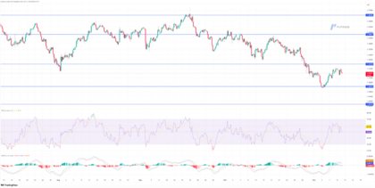 Los indicadores de momento muestran señales mixtas con leve sesgo correctivo. El RSI retrocede desde 60 hacia 57, indicando pérdida de impulso comprador, mientras que el MACD se aplana, con las líneas de señal convergiendo, lo que sugiere posible consolidación o corrección bajista a corto plazo.