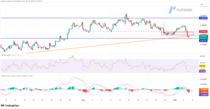 Mientras el precio se mantenga por debajo de 0.8755, cualquier rebote es probable que enfrente fuerte presión vendedora. De mantenerse este comportamiento, el par podría dirigirse hacia la siguiente zona de soporte relevante.