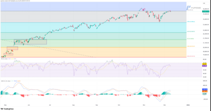El Nasdaq en la gráfica continúa operando cerca del límite superior de su rango reciente, justo por debajo del máximo previo en la zona de 25.900–26.000. El precio se mantiene por encima del nivel de retroceso Fibonacci del 78,6%, lo que confirma que la estructura alcista general sigue intacta.