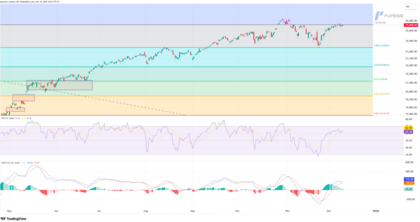 Un quiebre decisivo por encima de la resistencia podría abrir el camino hacia nuevos máximos, mientras que un rechazo en esta zona podría generar un retroceso saludable hacia el soporte de 23,900, vinculado a la región de Fibonacci. En general, el Nasdaq mantiene un sesgo alcista, pero luce extendido, con riesgo de corrección a corto plazo antes de cualquier avance adicional.