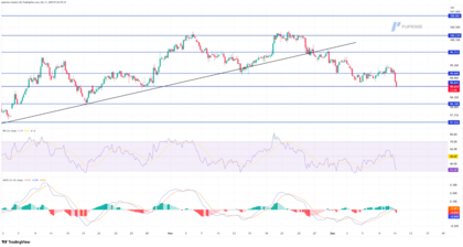 El DXY ha extendido su caída tras fallar repetidamente en recuperar la línea de tendencia alcista rota y la resistencia de 99.70, confirmando una estructura claramente bajista en el corto plazo. El quiebre decidido por debajo de 99.00 refuerza el dominio vendedor y abre paso hacia el soporte de 98.10.