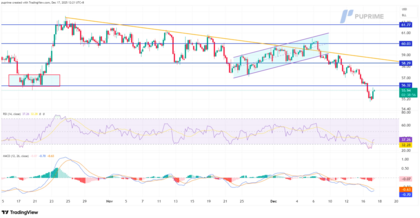 Los precios del petróleo crudo permanecen atrapados dentro de una tendencia bajista bien definida, caracterizada por una secuencia persistente de máximos descendentes y una caída superior al 10 % desde el máximo de noviembre. La estructura bajista se reforzó tras una ruptura decisiva de un patrón de bandera bajista, una señal clásica de continuación, seguida por la pérdida del soporte clave de liquidez en torno a $56,70 por barril.