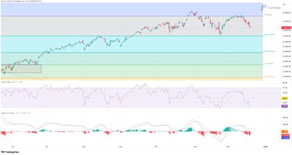 El Nasdaq mantiene una estructura técnica constructiva pese al retroceso reciente desde la zona de resistencia en 25.700, que continúa actuando como un área relevante de oferta tras el máximo del rally previo. Luego de romper al alza desde la base de consolidación de mitad de año, el precio ha retrocedido hacia la región de 24.650, lo que sugiere un movimiento correctivo más que un cambio completo de tendencia. La estructura alcista de fondo se mantiene mientras el índice conserve el soporte clave del mínimo creciente en torno a 23.900.