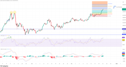 El oro superó de forma decisiva los 4.400 dólares, reforzando el impulso alcista, ya que los inversores persiguieron el movimiento pese a la baja liquidez estacional, lo que señala convicción y no toma de utilidades.