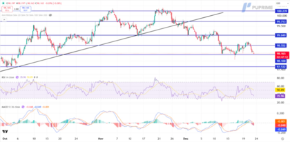 Una ruptura clara por debajo de 98.10 confirmaría la continuación de la estructura bajista predominante y podría activar un nuevo tramo descendente hacia el siguiente soporte en 97.55. Los indicadores técnicos refuerzan este sesgo negativo: el MACD muestra un aumento del momentum bajista y el RSI, situado en 36, se mantiene firmemente por debajo de su línea media, señalando presión vendedora sostenida.