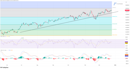 El Dow Jones Industrial Average continúa operando dentro de una estructura alcista bien definida, manteniendo una secuencia de máximos y mínimos crecientes pese a la reciente consolidación cerca de niveles récord. El precio se mantiene respaldado por encima de la línea de tendencia ascendente que guía el avance desde mediados de año, lo que refuerza la tendencia principal y sugiere que los retrocesos recientes han sido correctivos y no un cambio de tendencia.