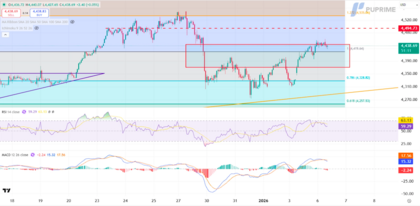 En el escenario alcista, una reactivación del impulso comprador podría llevar al metal hacia la resistencia en 4,495.00, con una extensión posterior hasta 4,535.00.