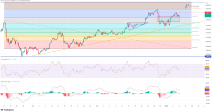 El oro se mantiene dentro de una estructura alcista de fondo, aunque la acción del precio ha entrado en una fase de consolidación tras el fuerte rally iniciado desde los mínimos de noviembre. El precio continúa respetando la línea de tendencia ascendente trazada desde finales de octubre, reforzando el sesgo positivo de mediano plazo. Además, se mantiene por encima del retroceso de Fibonacci 0,618 alrededor de 4.265, nivel que ha funcionado como soporte dinámico durante los retrocesos recientes.